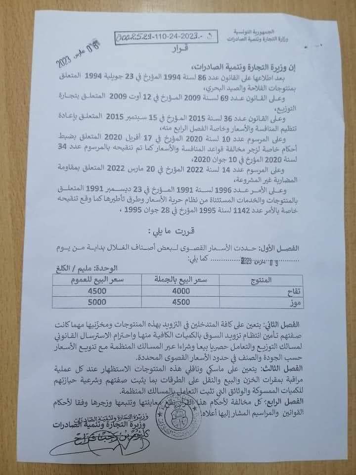 قرار وزاري: التفاح بـ4500 .. والموز بـ5000 (صور) من قبل saber 8 مارس، 2023 8 مارس، 2023 قررت وزارة التجارة وتنمية الصادرات تحديد الأسعار القصوى لصنفين من الغلال يتم اعتمادها بداية من تاريخ الخميس 9 مارس 2023 . وحددت الوزارة سعر بيع التفاح للعموم ب4500 والبيع بالجملة ب4000. فيما حددت سعر بيع الموز للعموم ب5000 وبالجملة بـ4500. شارك 0 FacebookTwitterEmail المقال السابق مريض يضرم النار بأحد الأقسام بالمستشفى الجامعي فطومة بورقيبة المقال الموالي غرفة تجار الخضر والغلال: لن يقع العمل غدا بالتسعيرة الجديدة للموز لهذا السبب.. مقالات ذات صلة وزارة الصحة: انطلاق الأسبوع العالمي للرضاعة الطبيعية من... 2 نوفمبر، 2025 وزارة الصحة: انطلاق الأسبوع العالمي للرضاعة الطبيعية من... 2 نوفمبر، 2025 إتفاقيات جديدة مع ليبيا وقطر لتأطير تشغيل التونسيين... 2 نوفمبر، 2025 16 ديسمبر.. النظر في مقترح قانون انتداب أصحاب... 30 أكتوبر، 2025 بداية من اليوم : الصّيدليّات تُوقف العمل بصيغة... 27 أكتوبر، 2025 وزارة الصحة : تقنية جديدة لتسريع تشخيص الأمراض... 25 أكتوبر، 2025