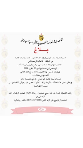 أكدت القنصلية العامة لتونس بميلانو في بلاغ لها، أنه لم يتم إلى حدّ اليوم 26 فيفري 2020 تسجيل أي إصابة في صفوف الجالية التونسية، بفيروس “كورونا”، في الدائرة مرجع النظر.