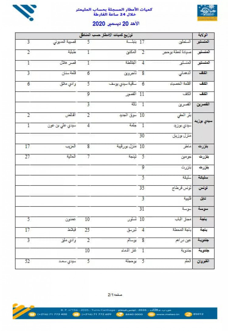 نشر المعهد الوطني للرصد الجوي اليوم، الأحد 20 ديسمبر 2020، كميات الأمطار المُسجلة خلال الـ24 ساعة الأخيرة في عدد من الجهات.