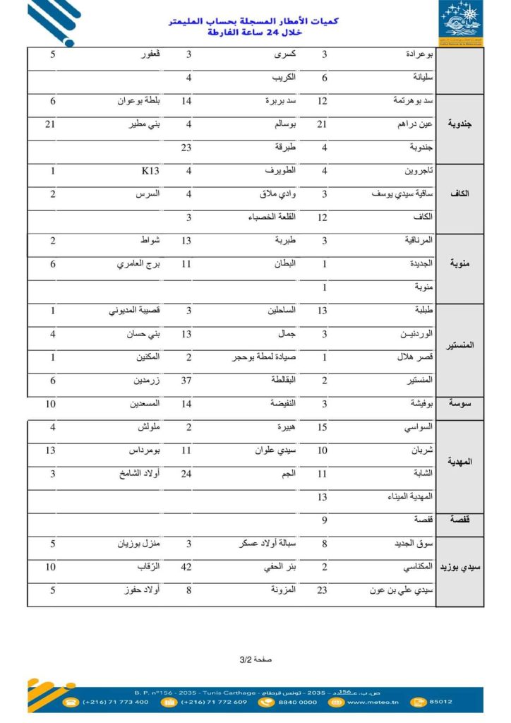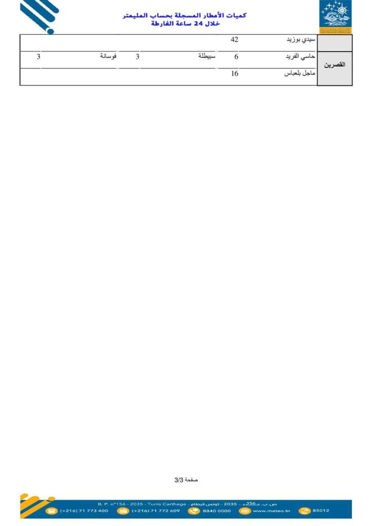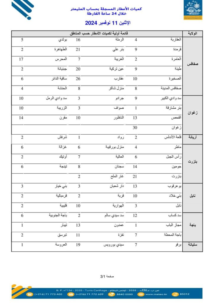 قائمة أوّلية لكميّات الأمطار المسجلة خلال 24 ساعة الفارطة ( من الساعة 07:00 ليوم 10نوفمبر إلى الساعة 07:00 ليوم 11 نوفمبر 2024)
