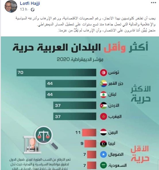حلّت تونس للعام الخامس على التوالي في المركز الأول عربيا في مؤشر الحريات لعام 2020، بحسب التقرير السنوي لمنظمة فريدوم هاوس الأميركية(Freedom house) ، مما جعلها ضمن الدول الحرة شأنها شأن كبريات الديمقراطيات في العالم، في حين جاءت سوريا في المرتبة الأخيرة.