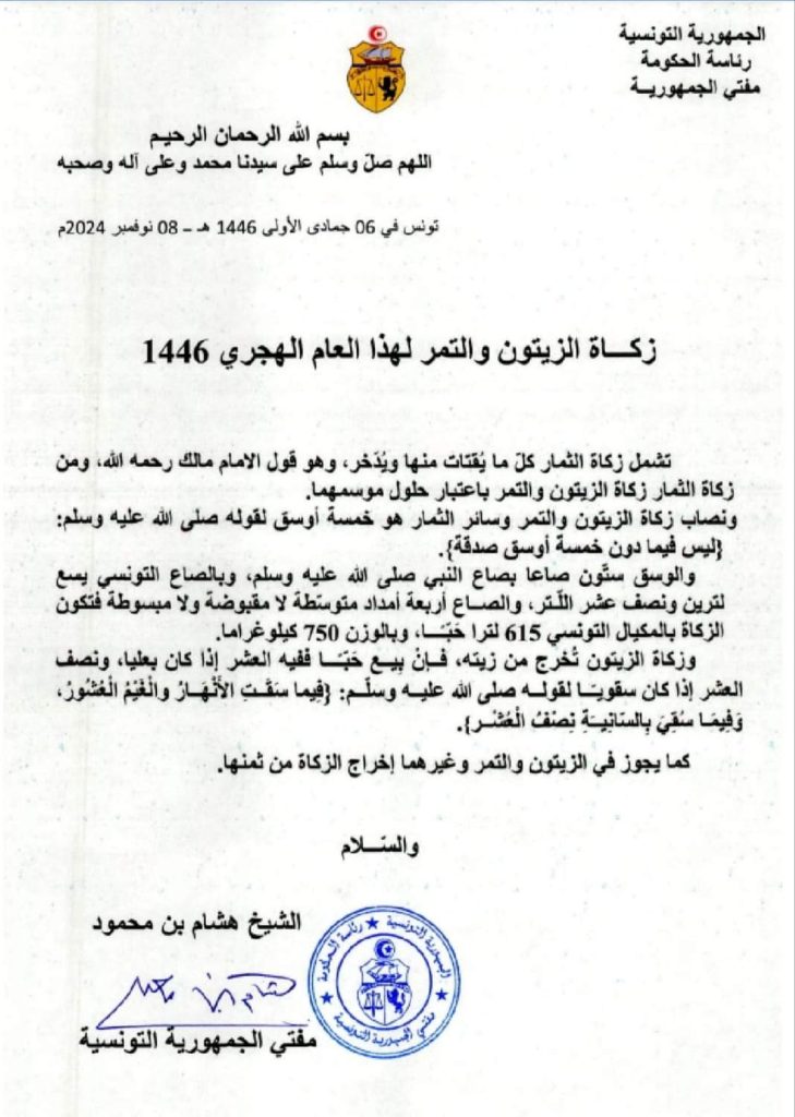 أعلن سماحة مفتي الجمهورية التونسية، هشام بن محمود أن نصاب زكاة الزيتون والتمر وسائر الثمار هو خمسة أوسق والوسق يساوي 60 صاعا بصاع النبي صلى الله عليه وسلم وبالصاع التونسي يسع لترين ونصف عشر اللتر والصاع أربعة أمداد متوسطة ولا مقبوضة ولا مبسوطة فتكون الزكاة بالمكيال التونسي 615 لترا حبا وبالوزن 750 كلغ.