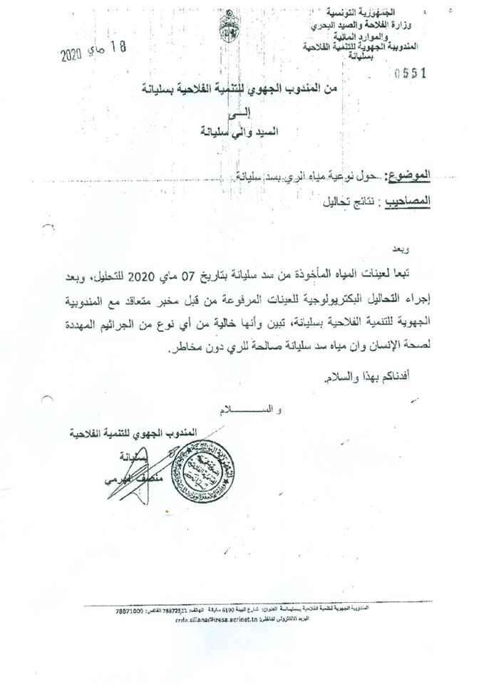 أثبتت نتائج التحليل المخبرية التي اجريت مؤخراً من طرف المندوبية الجهوية للفلاحة صلوحية مياه سد سليانة للري دون مخاطر وخلوها من أي جراثيم تحد صحة الانسان .