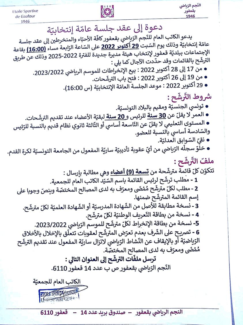 أعلنت الهيئة المديرة لفريق النجم الرياضي بقعفور أن الجلسة العامة الانتخابية للفريق للفترة النيابية 2025/2022 ستعقد يوم السبت 29 أكتوبر 2022 بداية من الساعة 16.00 مساء بمقر بلدية قعفور.وتقبل الترشحات لرئاسة النادي بداية من يوم 19 أكتوبر حتى يوم 26 أكتوبر 2022.كما انطلق الفريق في بيع الانخراطات الخاصة بالموسم الرياضي 2023/2022 من 17 إلى 28 أكتوبر 2022 وهي المخولة لأصحابها المشاركة في الجلسة الانتخابية للفريق.