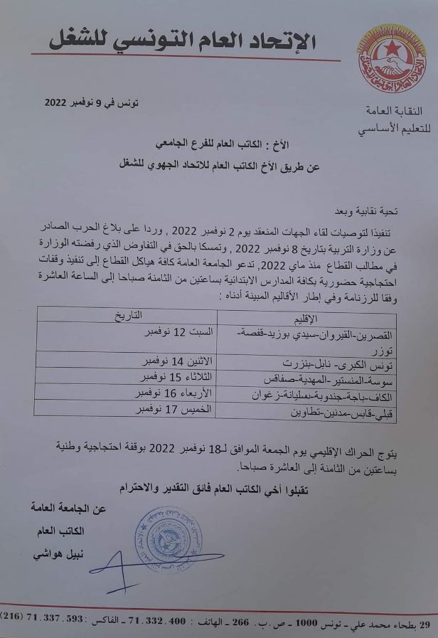 دعت النقابة العامة للتعليم الأساسي في بيان لها اليوم الأربعاء كافة منظوريها إلى تنفيذ وقفات احتجاجية حضورية بكافة المدارس الابتدائية بساعتين من الثامنة إلى العاشرة صباحا بداية من يوم السبت 12 نوفمبر 2022.