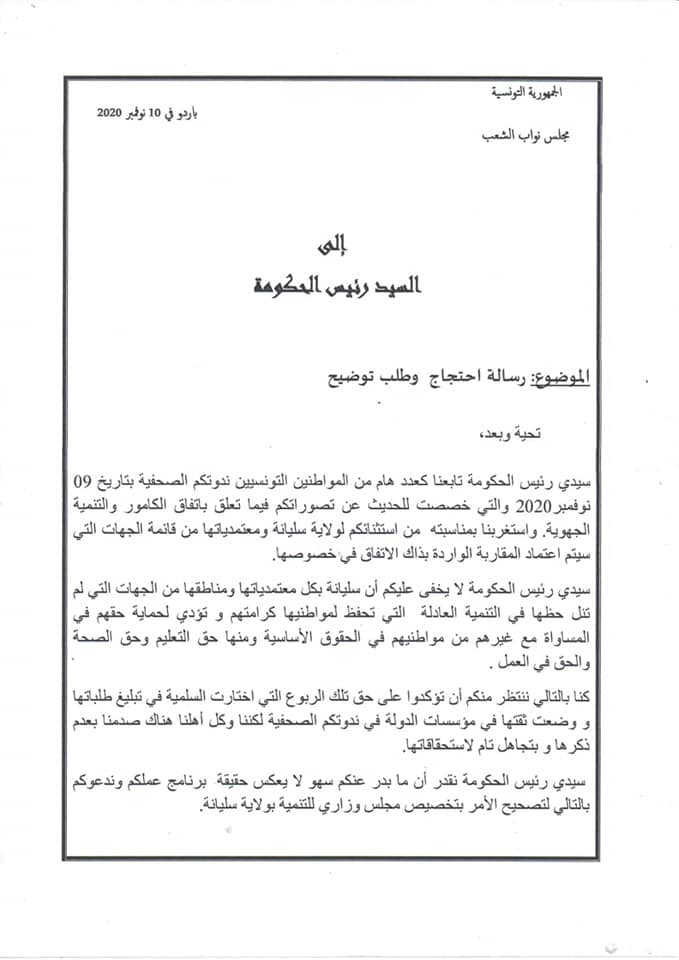 ندّد نواب الشعب عن ولاية سليانة في رسالة موجّهة لرئيس الحكومة هشام المشيشي ، بما اعتبروه “استثناء المشيشي لذكر ولاية سليانة ومعتمدياتها في قائمة الولايات والجهات التي ستحضى بمجلس وزاري خاص، أو التي ستنتفع بالمقاربة المعتمدة في حل إشكال الكامور”.