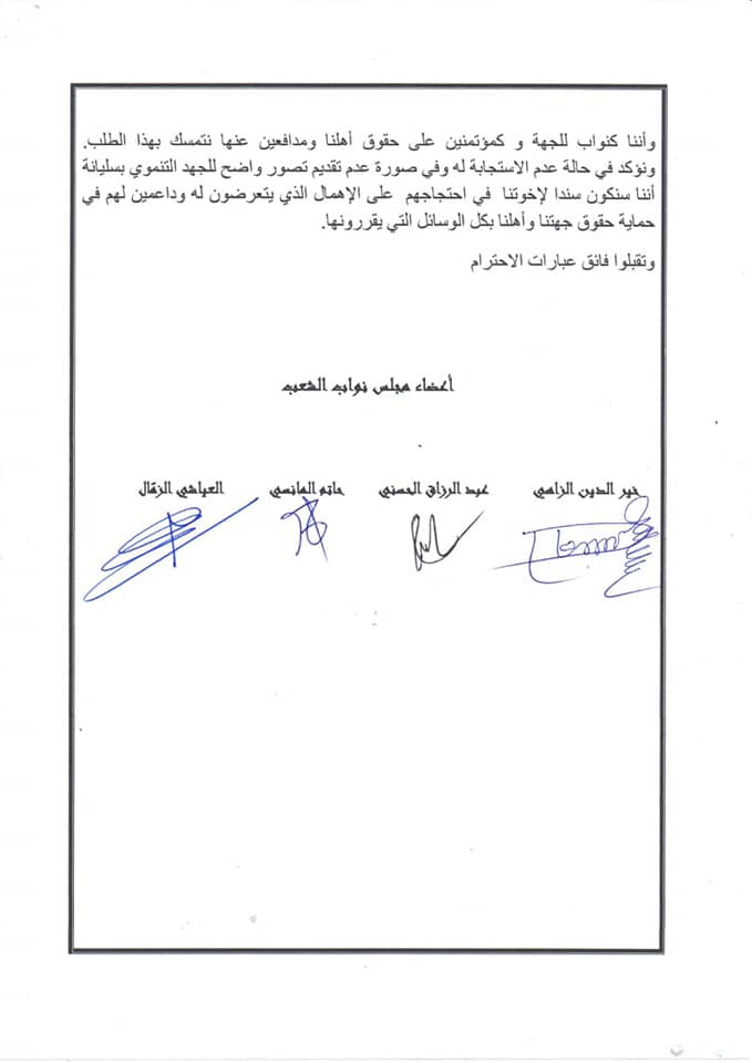 ونبّه النواب الموقّعون على الرسالة من إمكانية دخول أهالي الجهة في احتجاجات في صورة عدم الاستجابة لمطالبهم وعدم تقديم تصوّر واضح للجهد التنموي بسليانة، داعين رئيس الحكومة إلى تخصيص مجلس وزاري للتنمية بولاية سليانة.