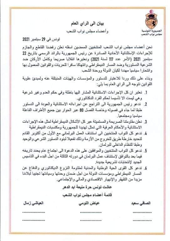كما دعا النواب لاستئناف العمل البرلماني الأول من أكتوبر 2021 لتحديد خارطة طريق للخروج من الأزمة تفعيلا لبنود الدستور.