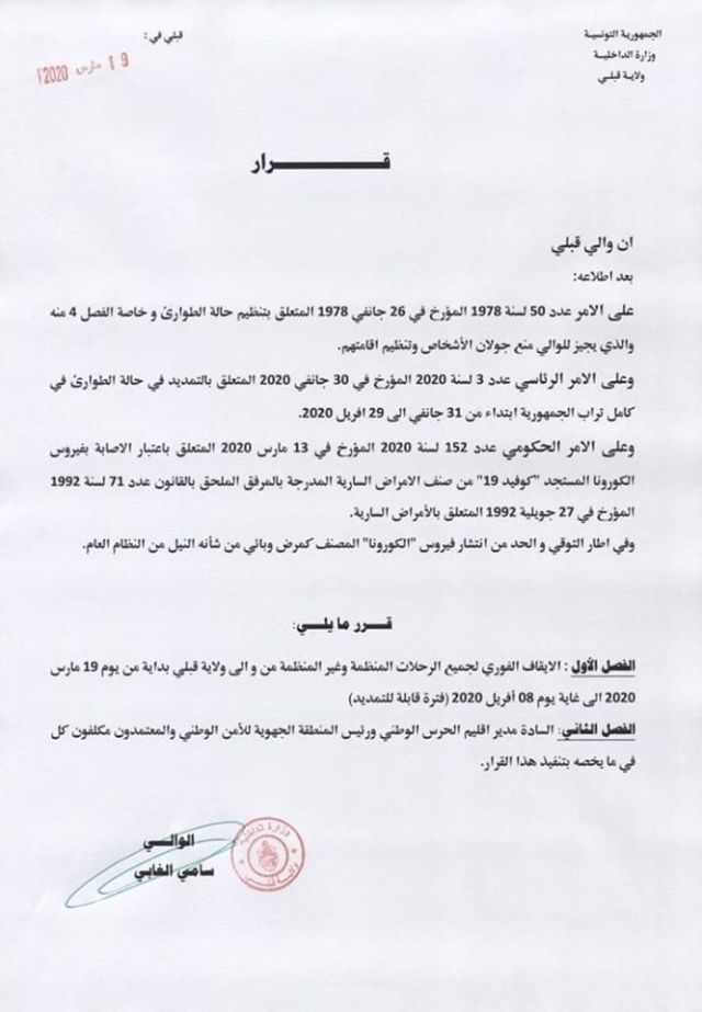 أعلن والي قبلي سامي الغابي اليوم الخميس 19 مارس 2020 عن تفعيل الفصل الرابع من قانون الطوارئ الذي يُجيز للوالي منع جولان الاشخاص وتنظيم اقامتهم .