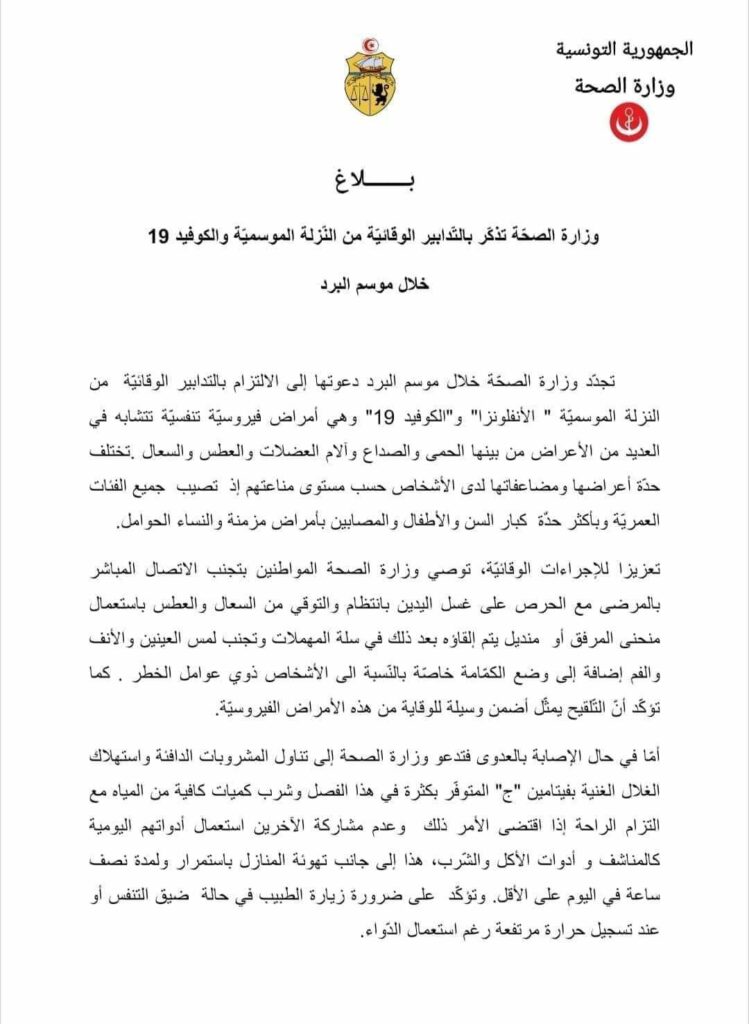 وزارة الصحة: تدابير الوقائية من النزلة الموسمية والكوفيد 19 خلال موسم البرد من قبل saber 30 يناير، 2024 30 يناير، 2024 وزارة الصحة تذكر بالتدابير الوقائية من النزلة الموسمية والكوفيد 19 خلال موسم البرد شارك 0 FacebookTwitterEmail المقال السابق سعيّد من روما: لا سلم في العالم إلا بتحرير كل فلسطين المقال الموالي سليانة: رجةأرضية بقوة 3.5 درجة بالروحية مقالات ذات صلة نقابة الصيدليات الخاصة تقرر إيقاف التكفل بصيغة الدافع... 17 سبتمبر، 2025 التهاب الكبد الفيروسي..الوقاية والفحص والتلقيح تجنّبك تدهور صحّتك 28 يوليو، 2025 منظمة صحفيون من أجل حقوق الإنسان و بالإشتراك... 15 يوليو، 2025 غدا: إجراء عمليات جراحية مجانية لسحب الماء الأبيض... 20 يونيو، 2025 وزارة الصحة تدعو إلى ضرورة القيام بالفحص الطبي... 18 يونيو، 2025 يمكن أن ينقل أمراضا فيروسية.. وزارة الصحة تقدم... 25 مايو، 2025