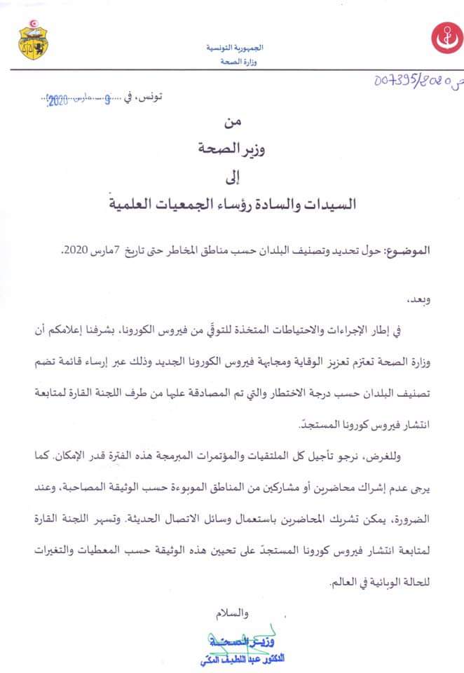 دعت وزارة الصحة رؤساء الجمعيات العلمية إلى تأجيل كل الملتقيات والمؤتمرات المبرمجة هذه الفترة قدر الإمكان وذلك في إطار التوقي من فيروس كورونا المستجد.