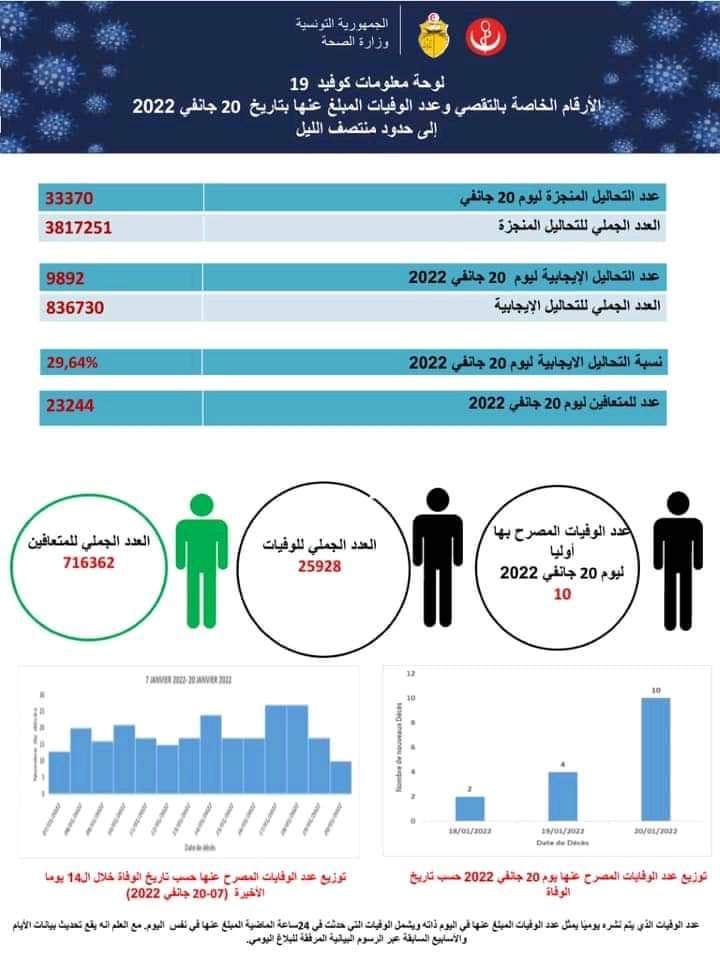 في آخر تحيين لها، أعلنت وزارة الصحة عن تسجيل 10 حالات وفاة و 9892 إصابة جديدة بفيروس كورونا من جملة 33370 عينة تم رفعها. و بذلك تكون نسبة التحاليل الايجابية قد بلغت 29.64 بالمئة.