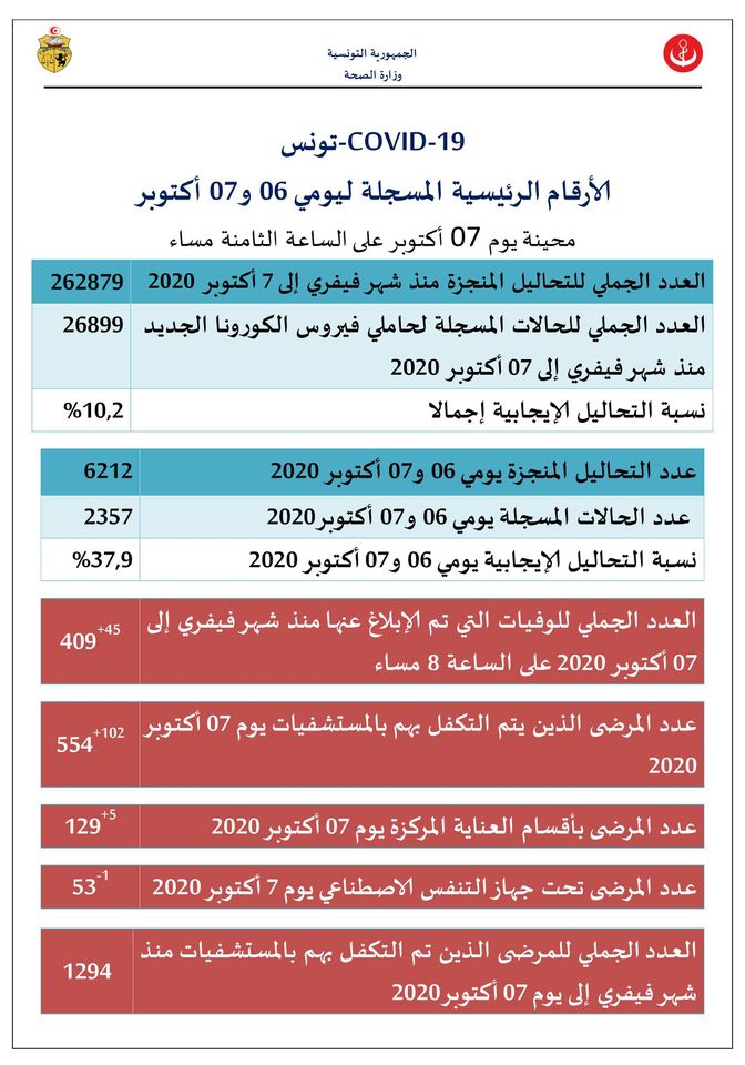 اعلنت وزارة الصحة في بلاغ صباح اليوم  الخميس 8  أكتوبر 2020 تسجيل 2357 إصابة جديدة بفيروس كورونا يومي 6 و 7 أكتوبر، وذلك من مجموع 6212 تحليل منجز في الفترة ذاتها.