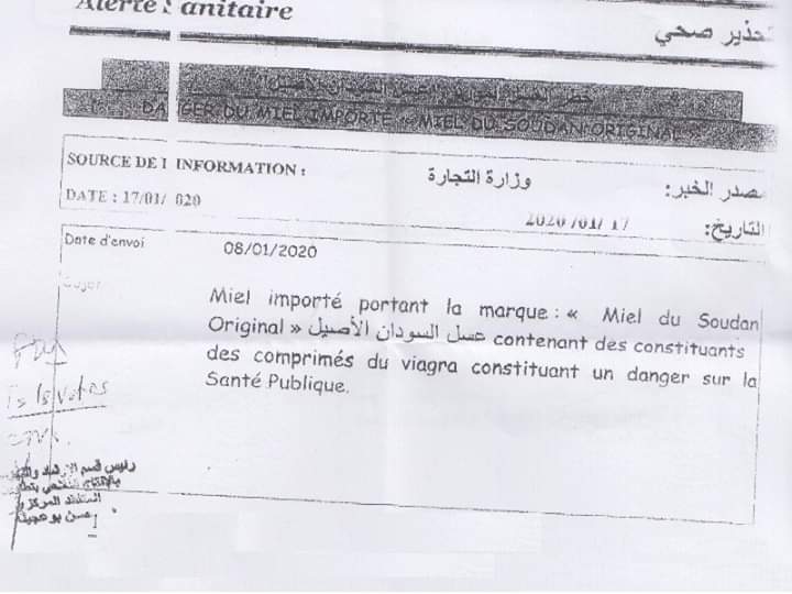 حذرت بلدية غمراسن عبر بلاغ نشرته في صفحتها الرسميةبفيسبوك أهالي الجهة من استعمال عسل مستورد يحمل إسم ”عسل السودان الاصيل” بسبب تضمنه لمكونات من الفياغرا مضرة بالصحة.