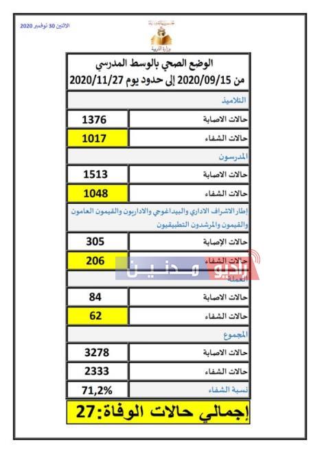 أما عدد حالات الشفاء، فتتوزع إلى 1017 حالة في صفوف التلاميذ، و1048 حالة في صفوف المدرسين، و206 حالة في صفوف إطار الإشراف الإداري والبيداغوجي، والإداريين، والقيمين العامين، والقيمين والمرشدين التطبيقيين، و62 حالة شفاء في صفوف العملة.