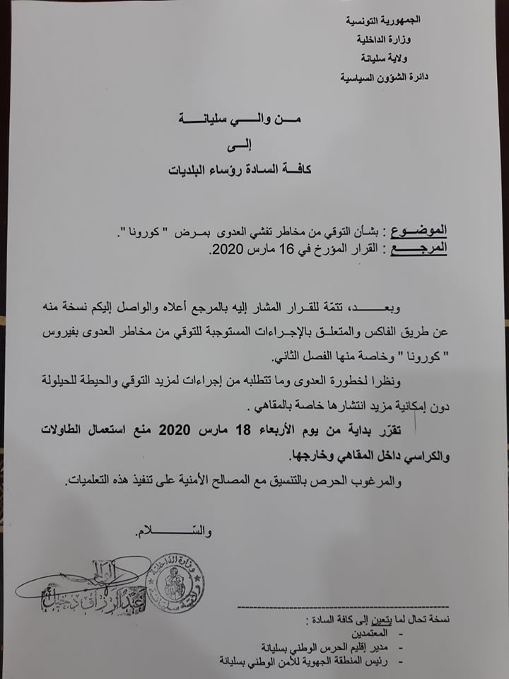 أصدر والي سليانة عبد الرزاق دخيل قرار تحصل موقع زاما انفو على نسخة منه يمنع إستعمال الطاولات والكراسي في المقاهي بالجهة وذلك في إطار التوقي من فيروس كورونا المستجد .