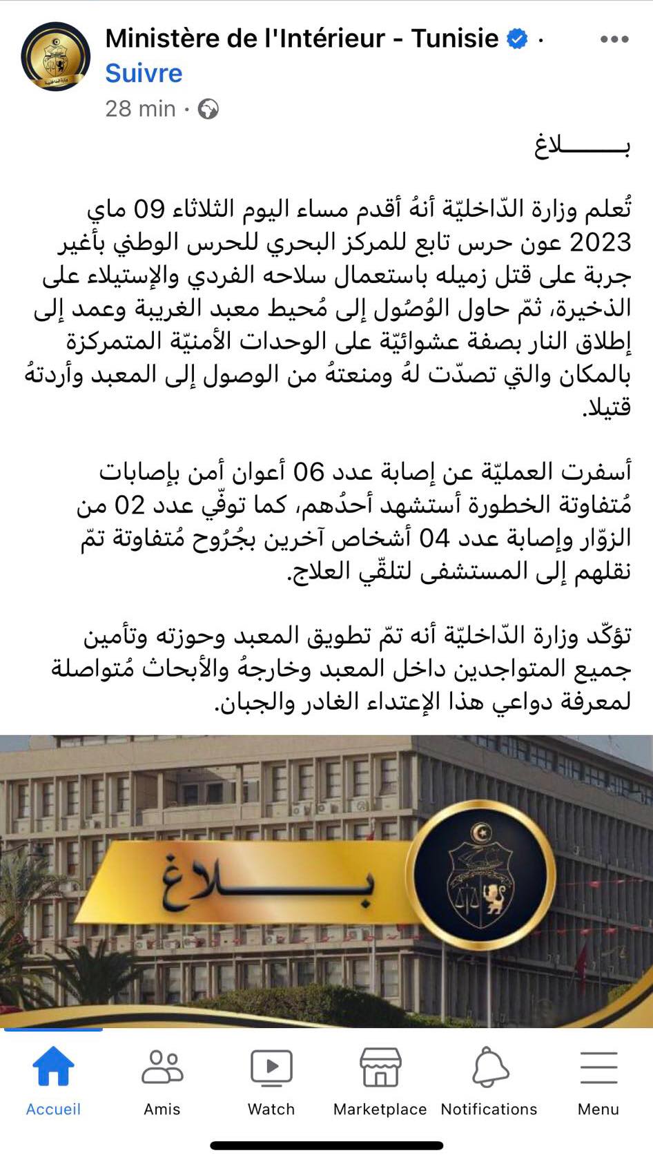 أعلنت وزارة الدّاخليّة أنهُ أقدم مساء اليوم الثلاثاء 09 ماي 2023 عون حرس تابع للمركز البحري للحرس الوطني بأغير جربة على قتل زميله باستعمال سلاحه الفردي والإستيلاء على الذخيرة، ثمّ حاول الوُصُول إلى مُحيط معبد الغريبة وعمد إلى إطلاق النار بصفة عشوائيّة على الوحدات الأمنيّة المتمركزة بالمكان والتي تصدّت لهُ ومنعتهُ من الوصول إلى المعبد وأردتهُ قتيلا.