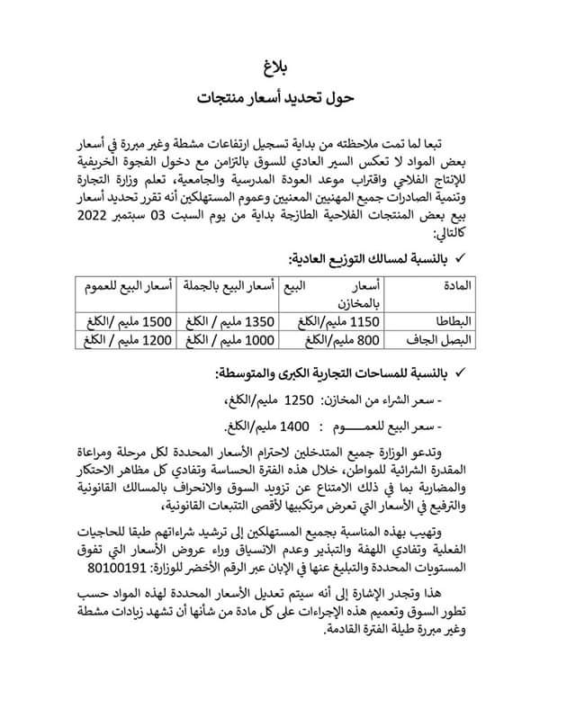 قررت وزارة التجارة تحديد أسعار بعض المنتجات و ذلك تبعا لما تمت ملاحظته من بداية تسجيل ارتفاعات مشطة وغير مبررة في أسعار بعض المواد لا تعكس السير العادي للسوق بالتزامن مع دخول الفجوة الخريفية للإنتاج الفلاحي واقتراب موعد العودة المدرسية والجامعية حسب بلاغ لها.