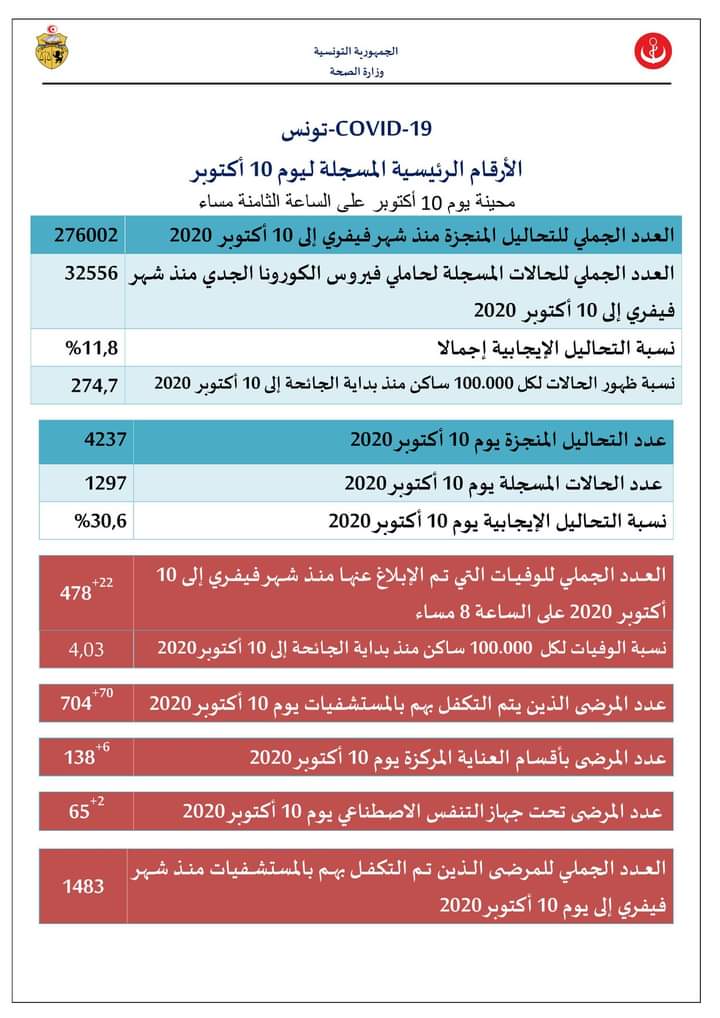 أعلنت وزارة الصحة في بلاغ لها الأحد 11 أكتوبر 2020، تسجيل 1297 إصابة جديدة بفيروس كورونا بتاريخ 10 من نفس الشهر ليبلغ العدد الجملي للحالات 32556.