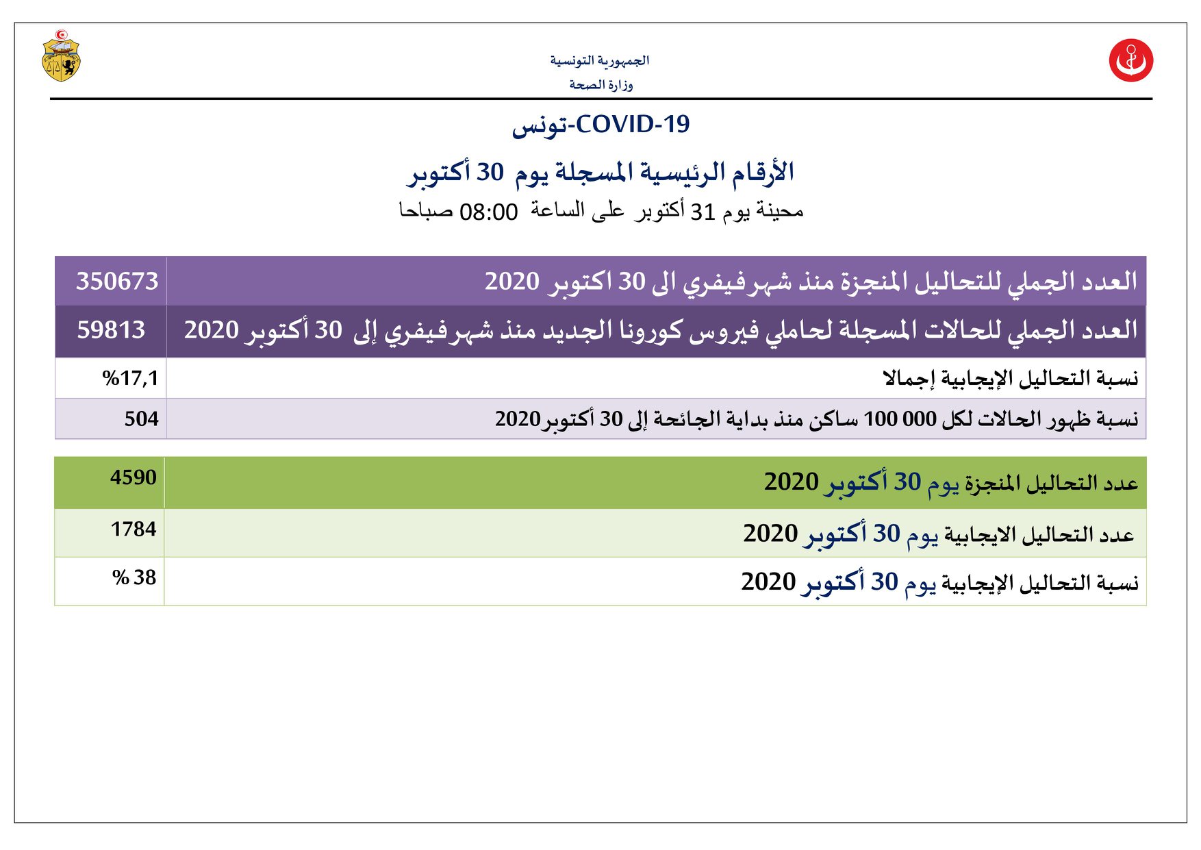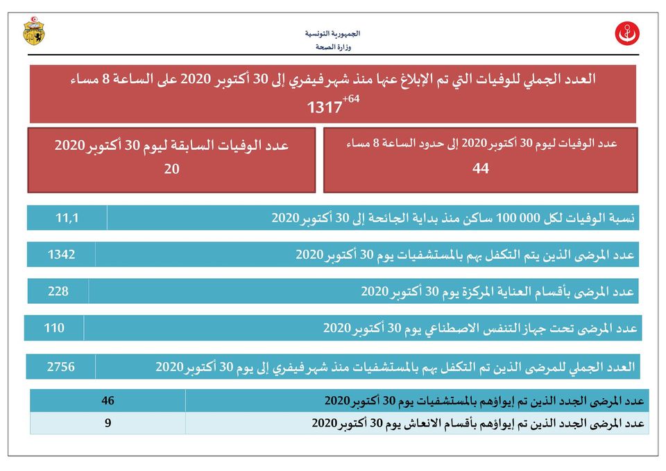 نشرت صباح اليوم وزارة الصحة في تحيين للحالة الوبائية في تونس تسجيل 1784 إصابة جديدة بكورونا و 64 حالة وفاة بتاريخ 30 أكتوبر الجاري ليكون العدد الاجمالي لحالات الاصابة بفيروس كورونا منذ بداية الجائحة 59813 و 1317 حالة وفاة.