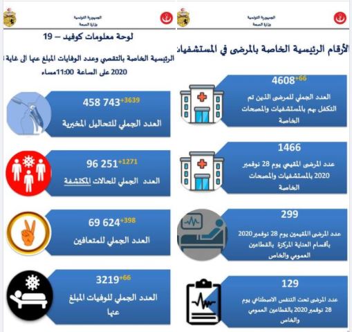 أعلنت وزارة الصحّة في بلاغ اليوم الأحد 29 نوفمبر 2020 أنّ عدد الإصابات الجديدة بفيروس كورونا بلغ 1271 إصابة، و66 حالة وفاة.